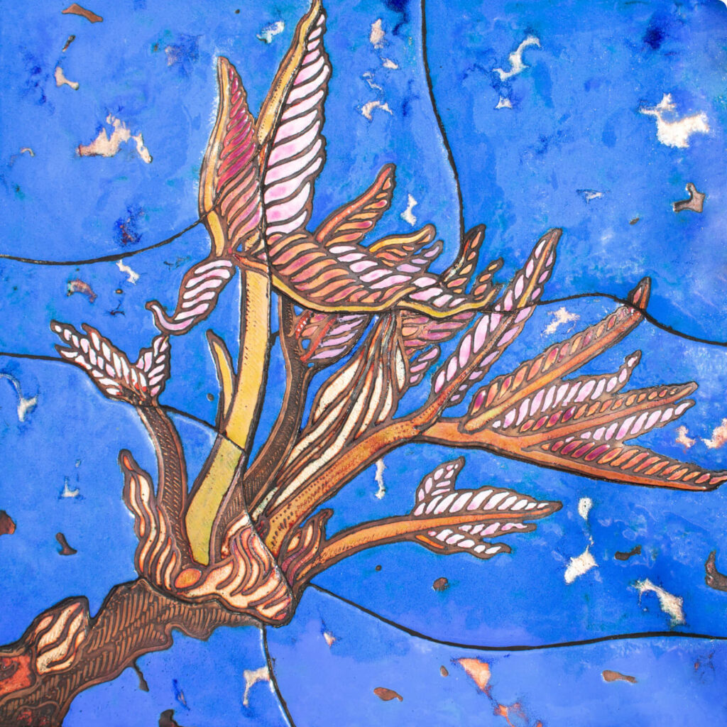 Ukrainian artist Oleksii Koval’s mixed media enamel and etchings to create environmentally inspired works that celebrate joy, diversity, and care.