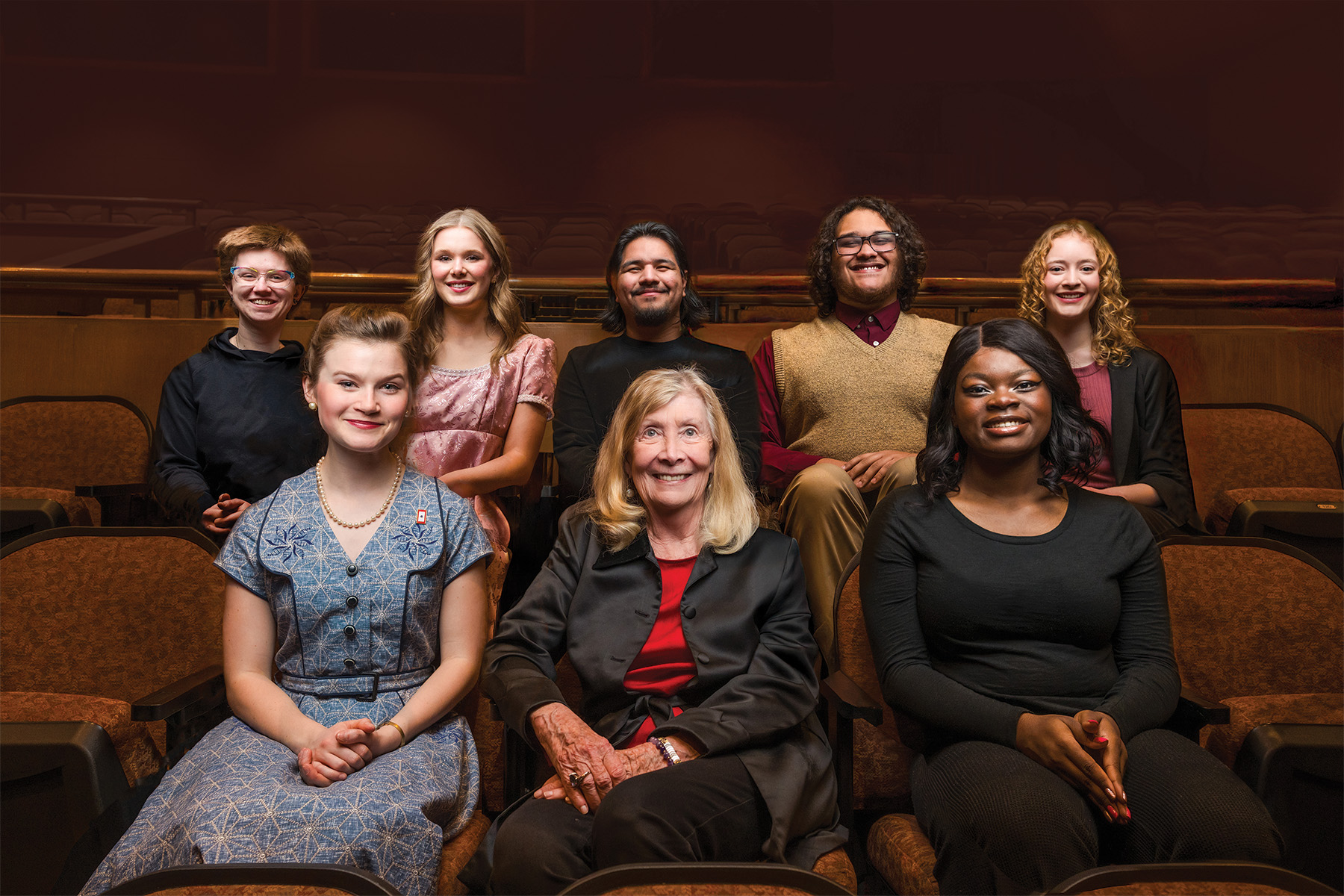 Pictured here with Nevalyn (center) is a promising young group of current Otterbein acting, dance, music, theatre, and design technology students. They represent the disciplines and programs that will benefit from Nevalyn’s transformational gift in the years to come.