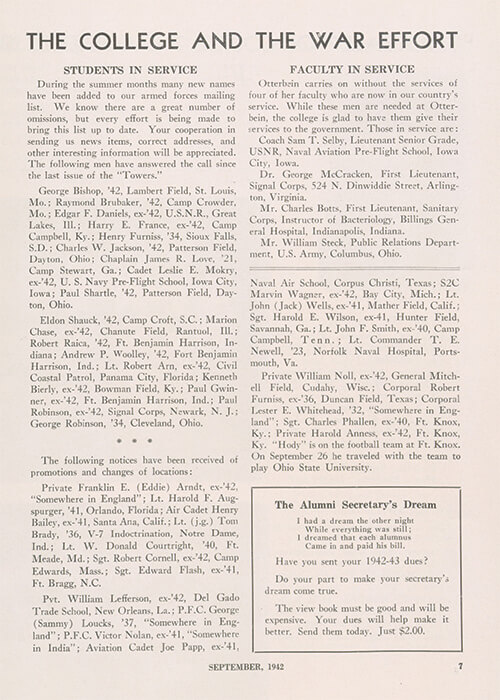 By March 1943, Otterbein had “given up six professors” and “sent forth 221 known graduates and students to the different branches of the service.”