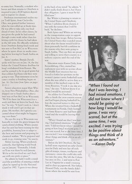 When Iraq invaded Kuwait on Aug. 2, 1990, the United States responded and many reservists were called to active duty, including seven Otterbein students. The Winter 1991 issue of Towers interviewed not only the students, but also alumni who were called to active duty, their families and supporters, and alumni with ties to the Middle East.