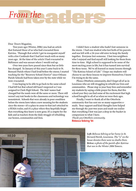 The stories included Rebecca Sebring ’84, who taught special education in the now-infamous Ninth Ward, one of the poorest and hardest hit districts, and Jay R. Hone ’75 and Marty Davis ’73, two Air Force reservists who lived across from each other as students at Otterbein and served together by chance in Louisiana after the hurricane.